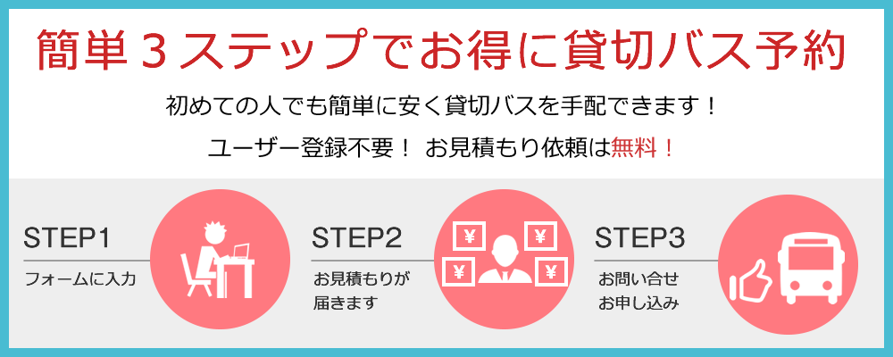 - 当サイトに登録している200社以上のバス会社様の中から、お客様の条件にあったバス会社を検索して、一斉にお見積もり依頼をいたします。